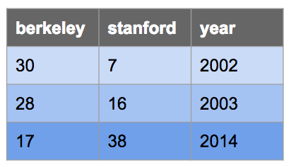berkeley INTEGER, stanford INTEGER, year INTEGER);